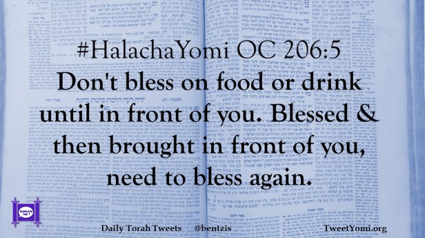 #HalachaYomi OC 206:5 Don’t bless on food or drink until in front of you. Blessed & then brought in front of you, need to bless again.