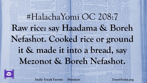 #HalachaYomi OC 208:7 Raw rice: say Haadama & Boreh Nefashot. Cooked rice or ground it & made it into a bread, say Mezonot & Boreh Nefashot.