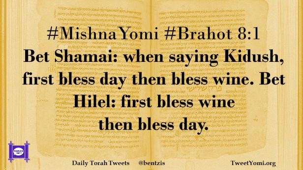 #MishnaYomi #Brahot 8:1 Bet Shamai: when saying Kidush, first bless day then bless wine. Bet Hilel: first bless wine then bless day.