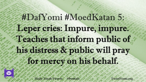 DafYomi, MoedKatan #DafYomi #MoedKatan 5 Date: January 17, 2022Author: ysspitz #DafYomi #MoedKatan 5: Leper cries: Impure, impure. Teaches that inform public of his distress & public will pray for mercy on his behalf. Share this: Share on X (Opens in new window) X Share on Facebook (Opens in new window) Facebook Like Loading... Related