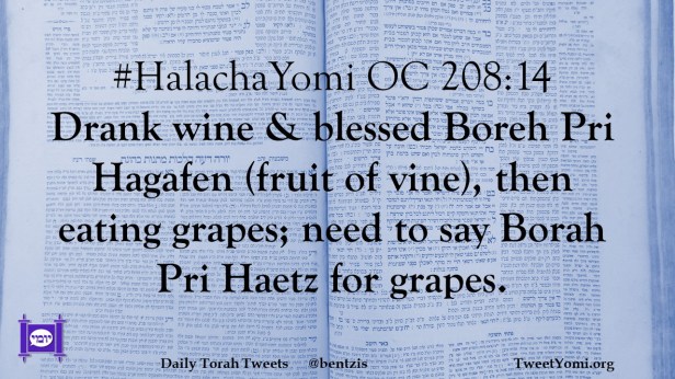 #HalachaYomi OC 208:14 Drank wine & blessed Boreh Pri Hagafen (fruit of vine), then eating grapes; need to say Borah Pri Haetz for grapes.