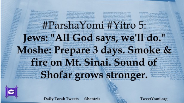 #ParshaYomi #Yitro 5: Jews: “All God says, we’ll do.” Moshe: Prepare 3 days. Smoke & fire on Mt. Sinai. Sound of Shofar grows stronger.