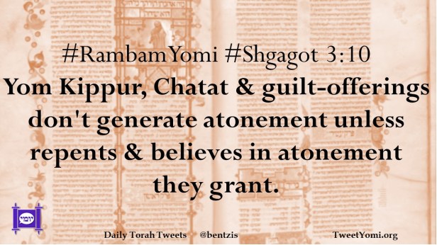 #RambamYomi #Shgagot 3:10 Yom Kippur, Chatat & guilt-offerings don’t generate atonement unless repents & believes in atonement they grant.