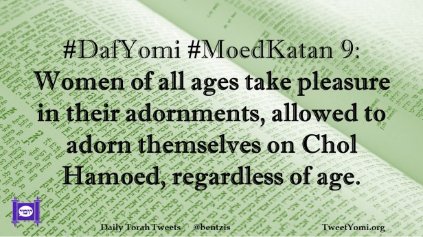 DafYomi, MoedKatan #DafYomi #MoedKatan 9 Date: January 22, 2022Author: ysspitz #DafYomi #MoedKatan 9: Women of all ages take pleasure in their adornments, allowed to adorn themselves on Chol Hamoed, regardless of age. Share this: Share on X (Opens in new window) X Share on Facebook (Opens in new window) Facebook Like Loading... Related