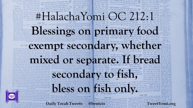 #HalachaYomi OC 212:1 Blessings on primary food exempt secondary, whether mixed or separate. If bread secondary to fish, bless on fish only.
