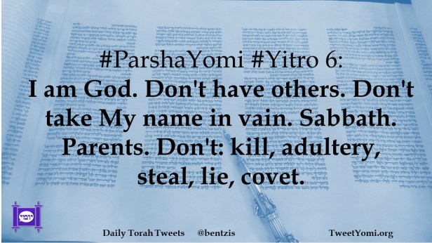 #ParshaYomi #Yitro 6: I am God. Don’t have others. Don’t take My name in vain. Sabbath. Parents. Don’t: kill, adultery, steal, lie, covet.