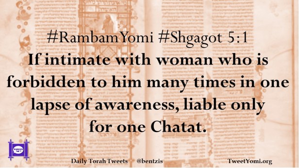 #RambamYomi #Shgagot 5:1 If intimate with woman who is forbidden to him many times in one lapse of awareness, liable only for one Chatat.