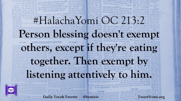 #HalachaYomi OC 213:2 Person blessing doesn’t exempt others, except if they’re eating together. Then exempt by listening attentively to him.