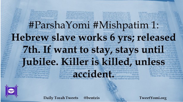#ParshaYomi #Mishpatim 1: Hebrew slave works 6 yrs; released 7th. If want to stay, stays until Jubilee. Killer is killed, unless accident.