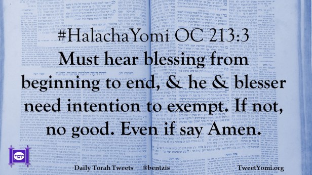 #HalachaYomi OC 213:3 Must hear blessing from beginning to end, & he & blesser need intention to exempt. If not, no good. Even if say Amen.