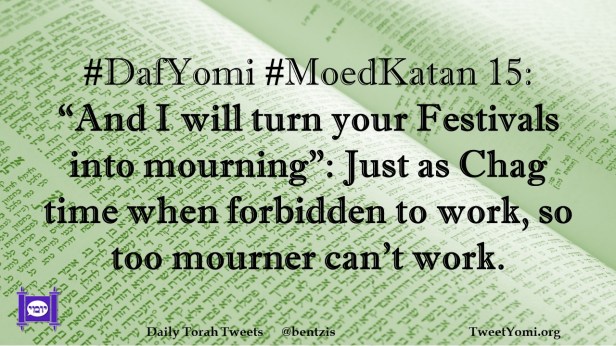 DafYomi, MoedKatan #DafYomi #MoedKatan 15 Date: January 27, 2022Author: ysspitz #DafYomi #MoedKatan 15: “And I will turn your Festivals into mourning”: Just as Chag time when forbidden to work, so too mourner can’t work. Share this: Share on X (Opens in new window) X Share on Facebook (Opens in new window) Facebook Like Loading... Related