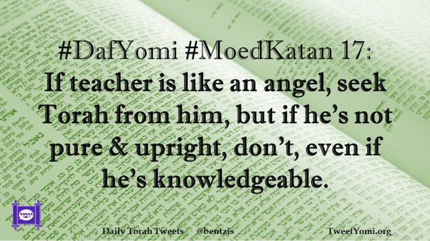 DafYomi, MoedKatan #DafYomi #MoedKatan 17 Date: January 29, 2022Author: ysspitz #DafYomi #MoedKatan 17: If teacher is like an angel, seek Torah from him, but if he’s not pure & upright, don’t, even if he’s knowledgeable. Share this: Share on X (Opens in new window) X Share on Facebook (Opens in new window) Facebook Like Loading... Related