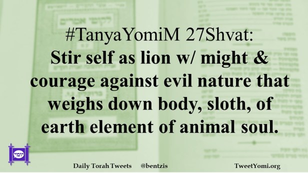 #TanyaYomiM 27Shvat: Stir self as lion w/ might & courage against evil nature that weighs down body, sloth, of earth element of animal soul.