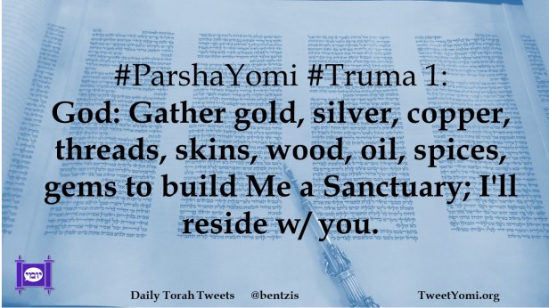 #ParshaYomi #Truma 1: God: Gather gold, silver, copper, threads, skins, wood, oil, spices, gems to build Me a Sanctuary; I’ll reside w/ you.