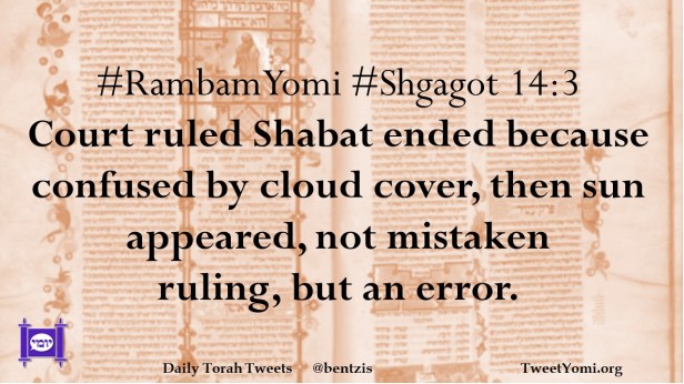 #RambamYomi #Shgagot 14:3 Court ruled Shabat ended because confused by cloud cover, then sun appeared, not mistaken ruling, but an error.