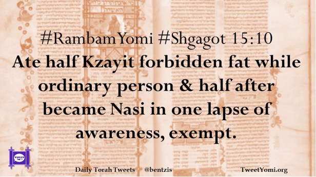 #RambamYomi #Shgagot 15:10 Ate half Kzayit forbidden fat while ordinary person & half after became Nasi in one lapse of awareness, exempt.
