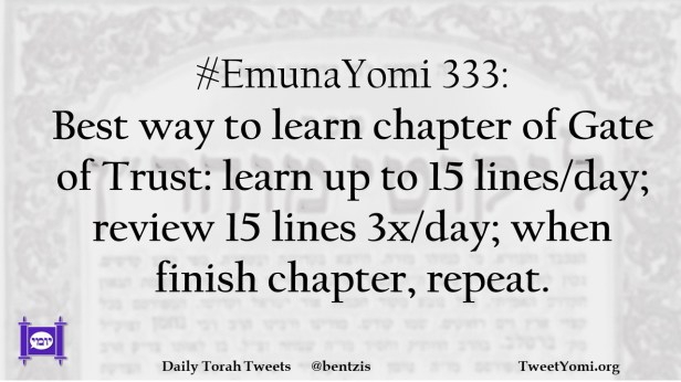 #EmunaYomi 333: Best way to learn chapter of Gate of Trust: learn up to 15 lines/day; review 15 lines 3x/day; when finish chapter, repeat.