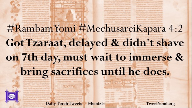 #RambamYomi #MechusareiKapara 4:2 Got Tzaraat, delayed & didn’t shave on 7th day, must wait to immerse & bring sacrifices until he does.