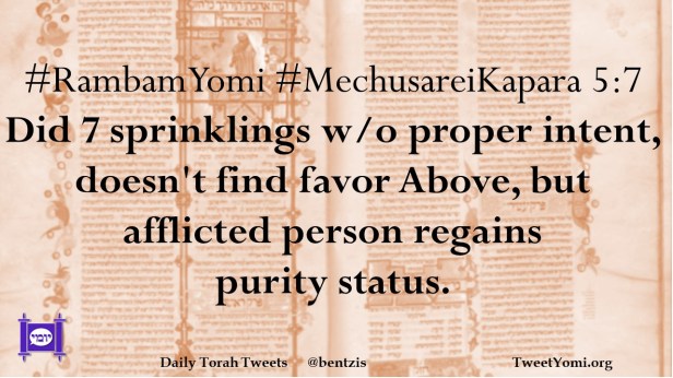 #RambamYomi #MechusareiKapara 5:7 Did 7 sprinklings w/o proper intent, doesn’t find favor Above, but afflicted person regains purity status.
