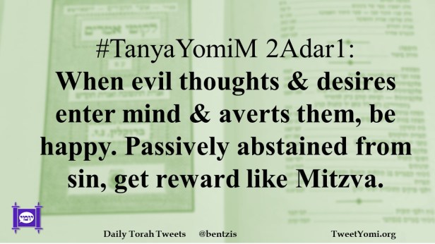 #TanyaYomiM 2Adar1: When evil thoughts & desires enter mind & averts them, be happy. Passively abstained from sin, get reward like Mitzva.