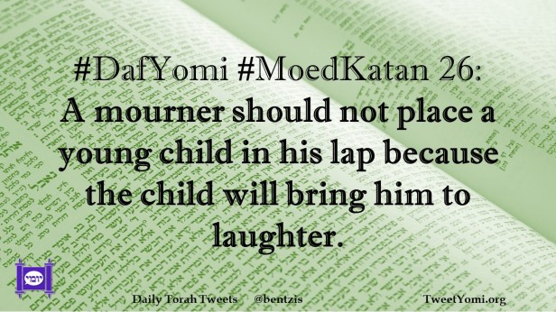 DafYomi, MoedKatan #DafYomi #MoedKatan 26 Date: February 8, 2022Author: ysspitz #DafYomi #MoedKatan 26: A mourner should not place a young child in his lap because the child will bring him to laughter. Share this: Share on X (Opens in new window) X Share on Facebook (Opens in new window) Facebook Like Loading... Related