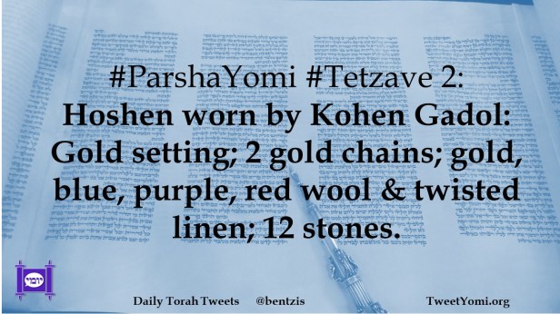 #ParshaYomi #Tetzave 2: Hoshen worn by Kohen Gadol: Gold setting; 2 gold chains; gold, blue, purple, red wool & twisted linen; 12 stones.