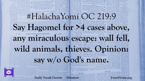 #HalachaYomi OC 219:9 Say Hagomel for >4 cases above, any miraculous escape: wall fell, wild animals, thieves. Opinion: say w/o God’s name.
