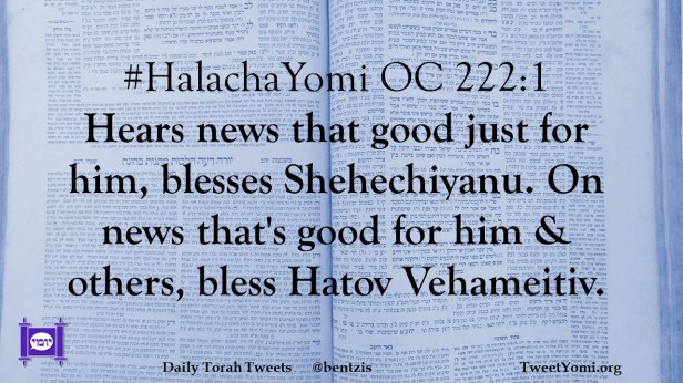 #HalachaYomi OC 222:1 Hears news that good just for him, blesses Shehechiyanu. On news that’s good for him & others, bless Hatov Vehameitiv.