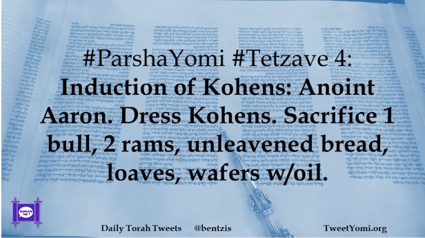 #ParshaYomi #Tetzave 4: Induction of Kohens: Anoint Aaron. Dress Kohens. Sacrifice 1 bull, 2 rams, unleavened bread, loaves, wafers w/oil.
