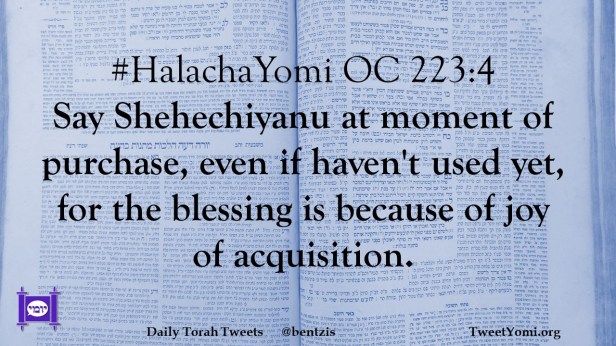 #HalachaYomi OC 223:4 Say Shehechiyanu at moment of purchase, even if haven’t used yet, for the blessing is because of joy of acquisition.
