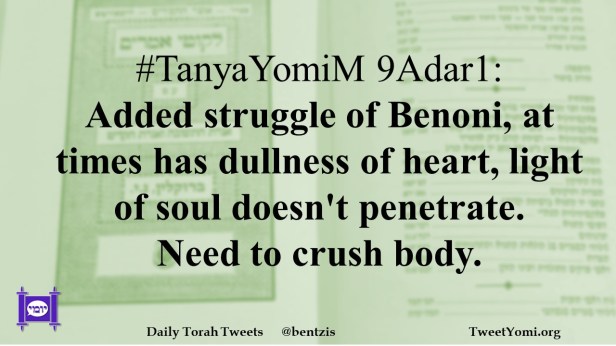 #TanyaYomiM 9Adar1: Added struggle of Benoni, at times has dullness of heart, light of soul doesn’t penetrate. Need to crush body.