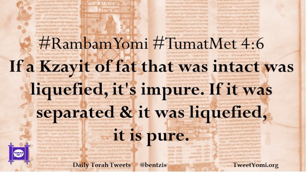 #RambamYomi #TumatMet 4:6 If a Kzayit of fat that was intact was liquefied, it’s impure. If it was separated & it was liquefied, it is pure.