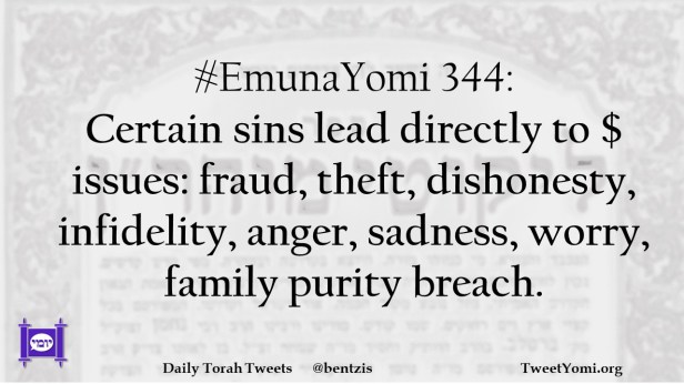 #EmunaYomi 344: Certain sins lead directly to $ issues: fraud, theft, dishonesty, infidelity, anger, sadness, worry, family purity breach.