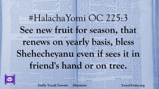 #HalachaYomi OC 225:3 See new fruit for season, that renews on yearly basis, bless Shehecheyanu even if sees it in friend’s hand or on tree.