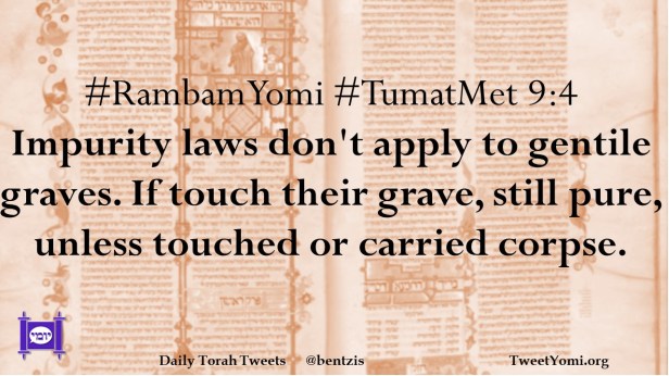 #RambamYomi #TumatMet 9:4 Impurity laws don’t apply to gentile graves. If touch their grave, still pure, unless touched or carried corpse.