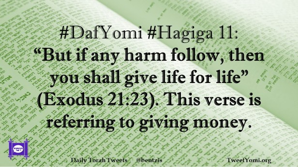 DafYomi, Hagiga #DafYomi #Hagiga 11 Date: February 21, 2022Author: ysspitz #DafYomi #Hagiga 11: “But if any harm follow, then you shall give life for life” (Exodus 21:23). This verse is referring to giving money. Share this: Share on X (Opens in new window) X Share on Facebook (Opens in new window) Facebook Like Loading... Related
