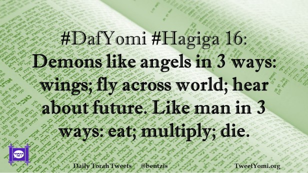 DafYomi, Hagiga #DafYomi #Hagiga 16 Date: February 27, 2022Author: ysspitz #DafYomi #Hagiga 16: Demons like angels in 3 ways: wings; fly across world; hear about future. Like man in 3 ways: eat; multiply; die. Share this: Share on X (Opens in new window) X Share on Facebook (Opens in new window) Facebook Like Loading... Related