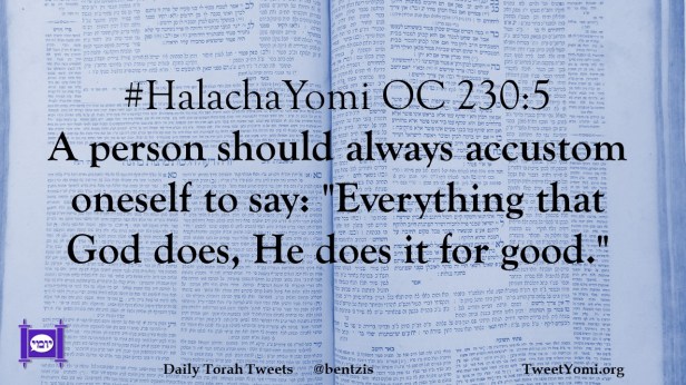 HalachaYomi #HalachaYomi OC 230:5 Date: February 27, 2022Author: ysspitz #HalachaYomi OC 230:5 A person should always accustom oneself to say: “Everything that God does, He does it for good.” Share this: Share on X (Opens in new window) X Share on Facebook (Opens in new window) Facebook Like Loading... Related