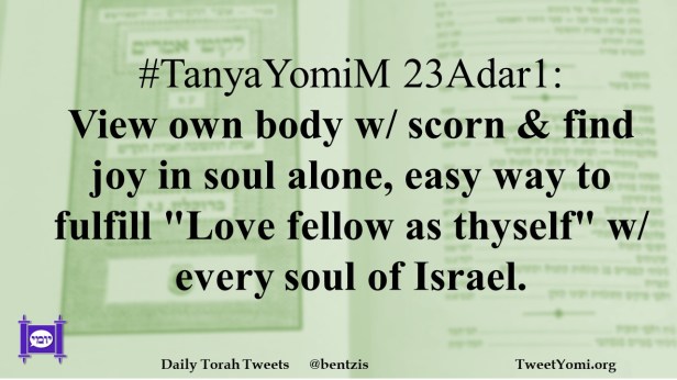 #TanyaYomiM 23Adar1: View own body w/ scorn & find joy in soul alone, easy way to fulfill “Love fellow as thyself” w/ every soul of Israel.