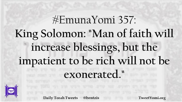 EmunaYomi #EmunaYomi 357 Date: March 1, 2022Author: ysspitz #EmunaYomi 357: King Solomon: “Man of faith will increase blessings, but the impatient to be rich will not be exonerated.” Share this: Share on X (Opens in new window) X Share on Facebook (Opens in new window) Facebook Like Loading... Related