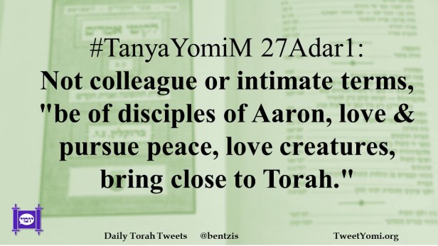 #TanyaYomiM 27Adar1: Not colleague or intimate terms, “be of disciples of Aaron, love & pursue peace, love creatures, bring close to Torah.”