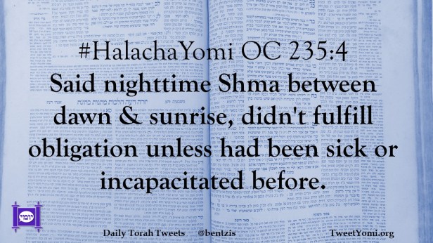 #HalachaYomi OC 235:4 Said nighttime Shma between dawn & sunrise, didn’t fulfill obligation unless had been sick or incapacitated before.