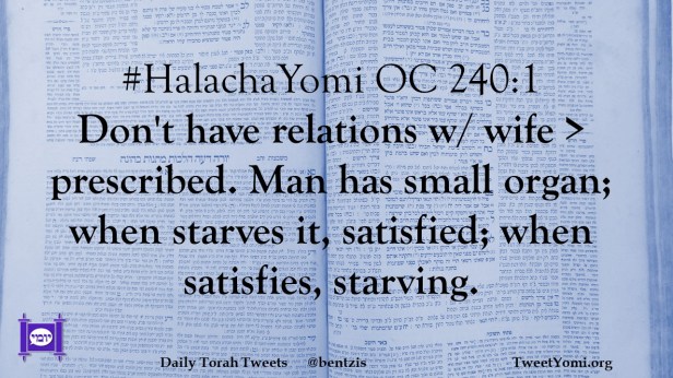#HalachaYomi OC 240:1 Don’t have relations w/ wife > prescribed. Man has small organ; when starves it, satisfied; when satisfies, starving.
