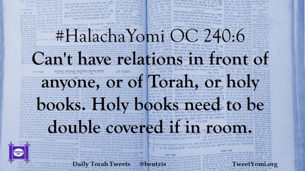 #HalachaYomi OC 240:6 Can’t have relations in front of anyone, or of Torah, or holy books. Holy books need to be double covered if in room.