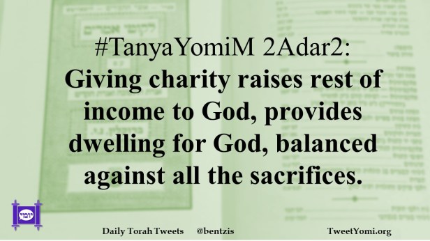 #TanyaYomiM 2Adar2: Giving charity raises rest of income to God, provides dwelling for God, balanced against all the sacrifices.