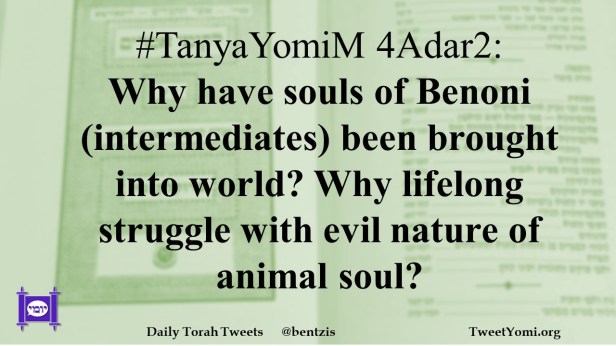 #TanyaYomiM 4Adar2: Why have souls of Benoni (intermediates) been brought into world? Why lifelong struggle with evil nature of animal soul?