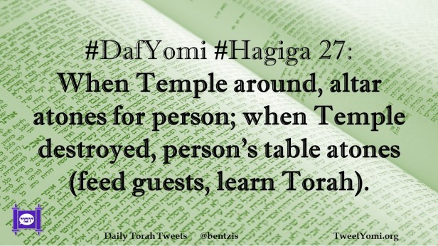 DafYomi, Hagiga #DafYomi #Hagiga 27 Date: March 9, 2022Author: ysspitz #DafYomi #Hagiga 27: When Temple around, altar atones for person; when Temple destroyed, person’s table atones (feed guests, learn Torah). Share this: Share on X (Opens in new window) X Share on Facebook (Opens in new window) Facebook Like Loading... Related