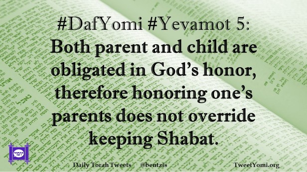 DafYomi, Yevamot #DafYomi #Yevamot 5 Date: March 11, 2022Author: ysspitz #DafYomi #Yevamot 5: Both parent and child, are obligated in God’s honor, therefore honoring one’s parents does not override keeping Shabat. Share this: Share on X (Opens in new window) X Share on Facebook (Opens in new window) Facebook Like Loading... Related