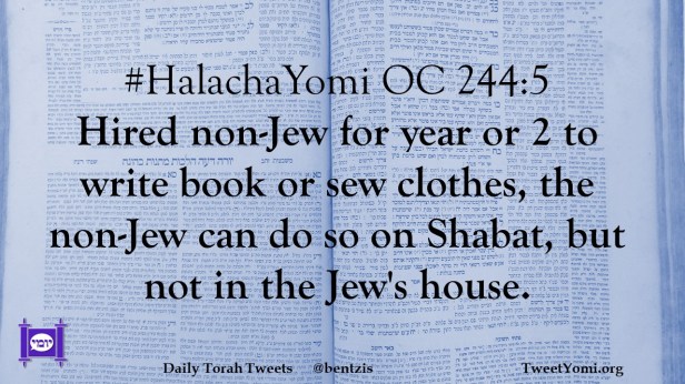 #HalachaYomi OC 244:5 Hired non-Jew for year or 2 to write book or sew clothes, the non-Jew can do so on Shabat, but not in the Jew’s house.