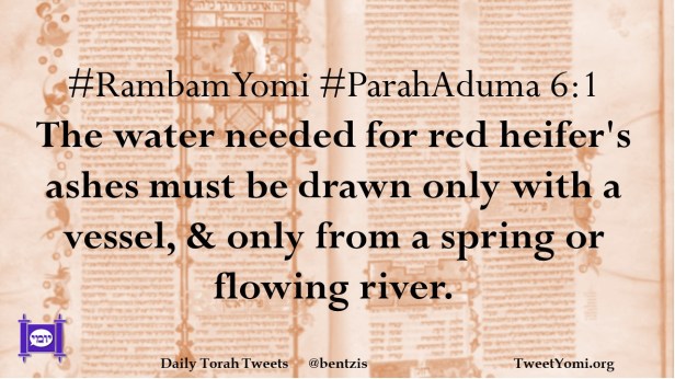 #RambamYomi #ParahAduma 6:1 The water needed for red heifer’s ashes must be drawn only with a vessel, & only from a spring or flowing river.